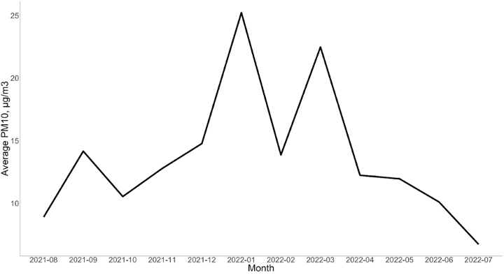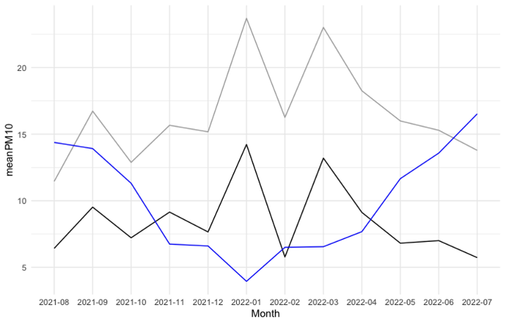 Miriam used the data on one kind of pollutant called particulate matter (PM10) from the 14 different sensors in Ashley Ward, over the course of the year (August 2021 to 2022). She took the average reading across all sensors and then the average by month – reducing hundreds of thousands of datapoints to just 12. This revealed that, on the whole, particulate levels are higher in the winter months.