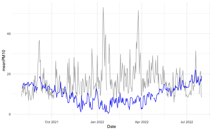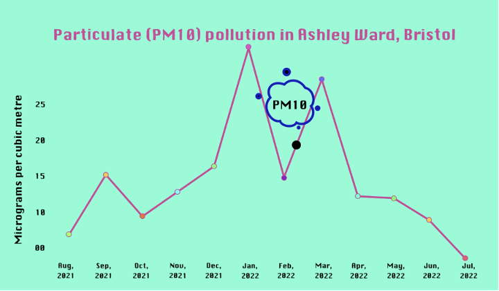 What Miriam observed was that air quality deteriorates in the winter in Ashley Ward and improves in the summer. This correlates with how people behave when it’s cold outside, with more people driving their cars and lighting their wood burners. Also, cold air sinks and traps air pollution near to the ground, especially when there’s little wind (as in January and March 2022).