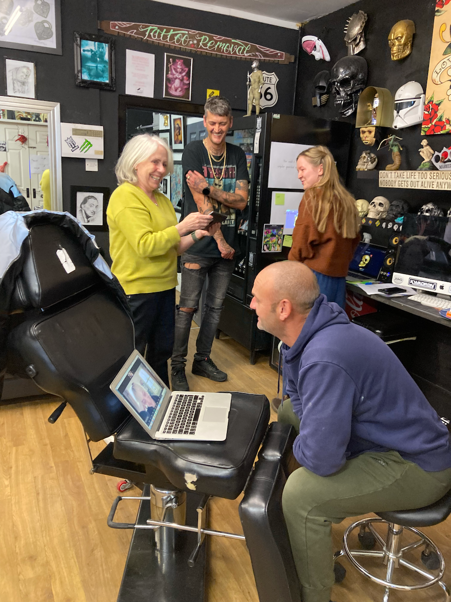 After, we (KWMC / BDFI / LV / Alice) facilitated a drop-in workshop at Marked Up Tattoo Studio to find out what local people think about AI in relation to tattooing. We created different areas of playful activities to gradually build up to discussing deep topics around AI, including: