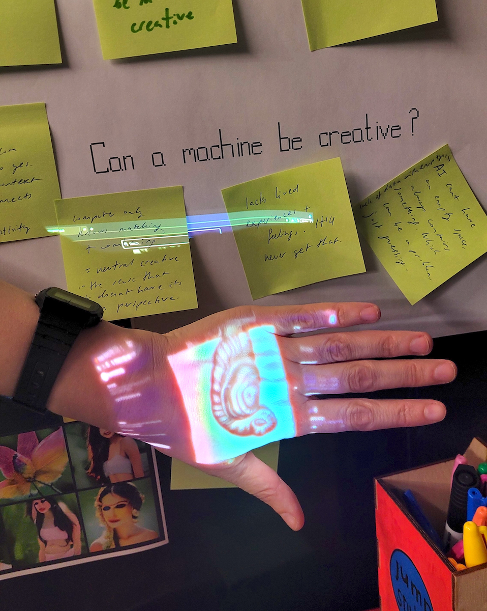- Playing with an online text-to-image generator, typing in prompts to generate a new tattoo then projecting these images onto the body.