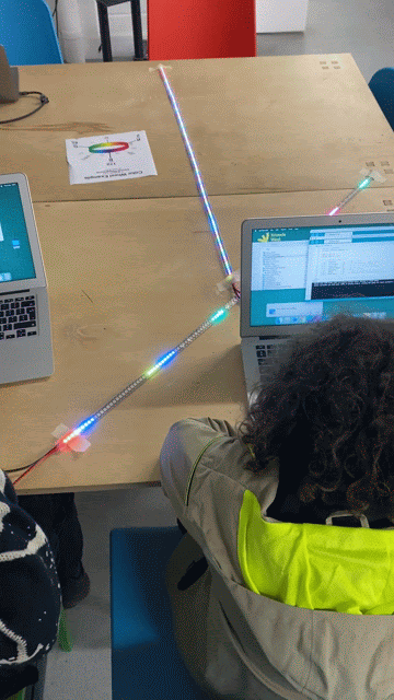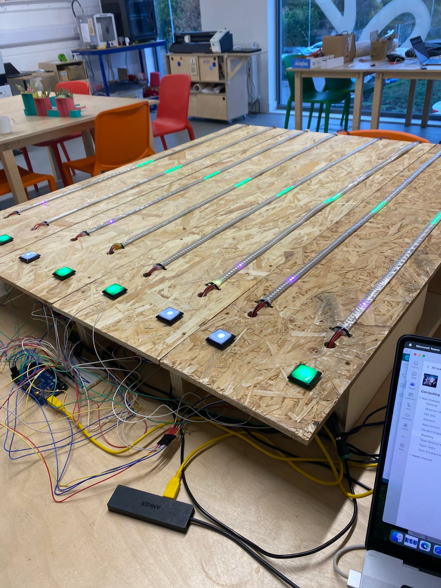 I then designed an LED programming and game design workshop for young people living on Andover Road. Together, we learned how LEDs work, programmed our own light effects, and co-created the rules of the game. We eventually settled on a collaborative rally-style game: players work together to keep the ball moving, with difficulty increasing over time by shrinking the paddle size and adjusting ball speed. Each completed rally triggers a celebratory animation across all eight strips. The group also created a scoring system and chose colours for each level — making the game their own.