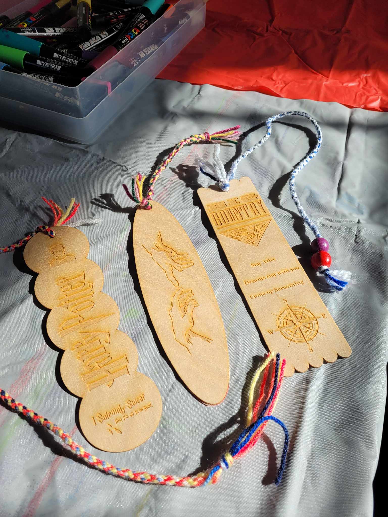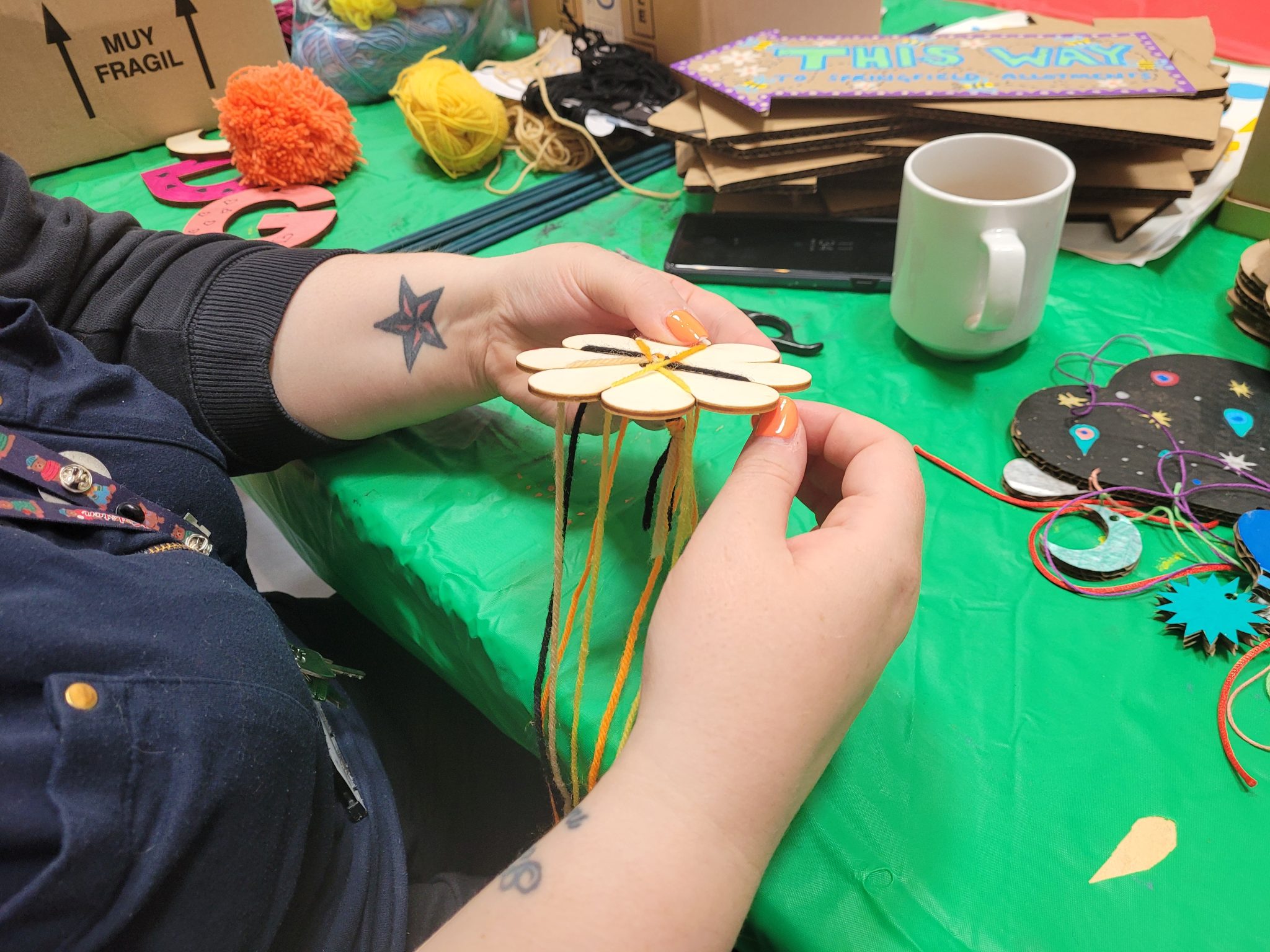 One of our favourite things about Creative Cuppa is seeing local people of all ages sharing their skills and teaching us all new things. In one of the first ever sessions in May 2023, Julian (who began The Art of Kindness project) showed us how to braid friendship bracelets using a handmade cardboard template. Inspired by this, we laser cut our own templates into wood over at The Factory and since then they have been a popular craft choice at every session. Regular Creative Cuppa-er Frank has made dozens of braids in all sorts of colours, even learning how to make more advanced braids using YouTube.