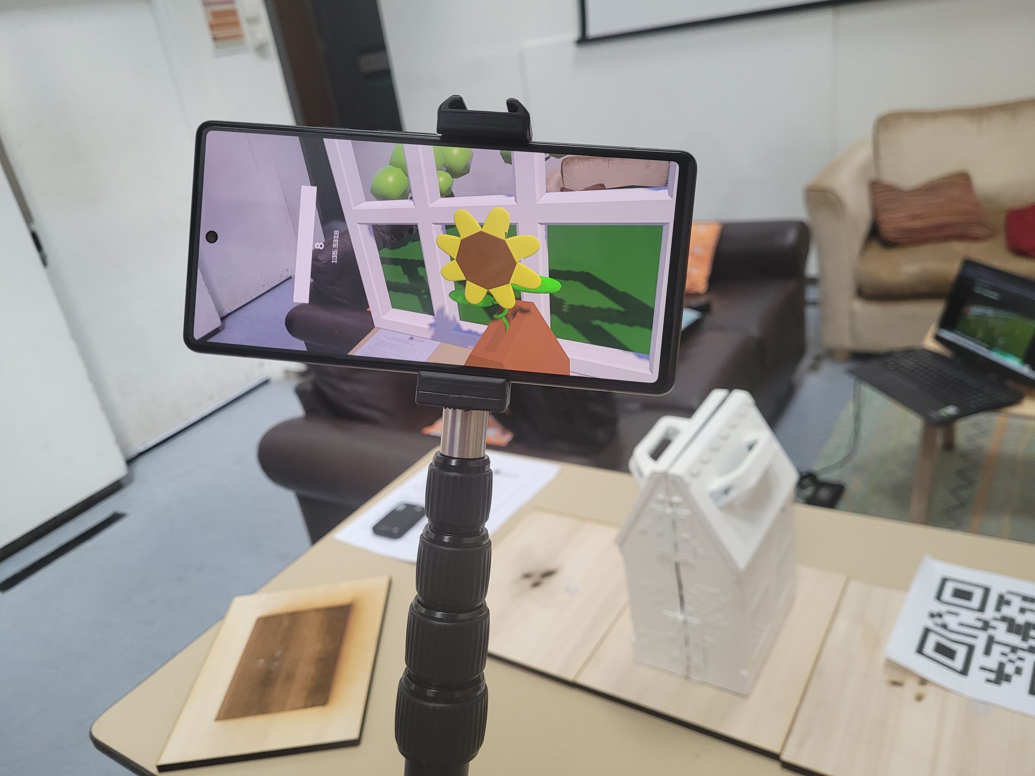We have played with some digital equipment during sessions as well. Local mum Becky wanted to create some personalised ‘thank you’ gifts for schoolteachers with her friends. So together we designed personal bookmarks and keyrings on the computer then laser cut them. We got some more creative technology inspiration in another session by inviting a Masters Immersive Technology (University of Bristol) student named James to test his creative augmented reality experience which used data from our Twinergy project.