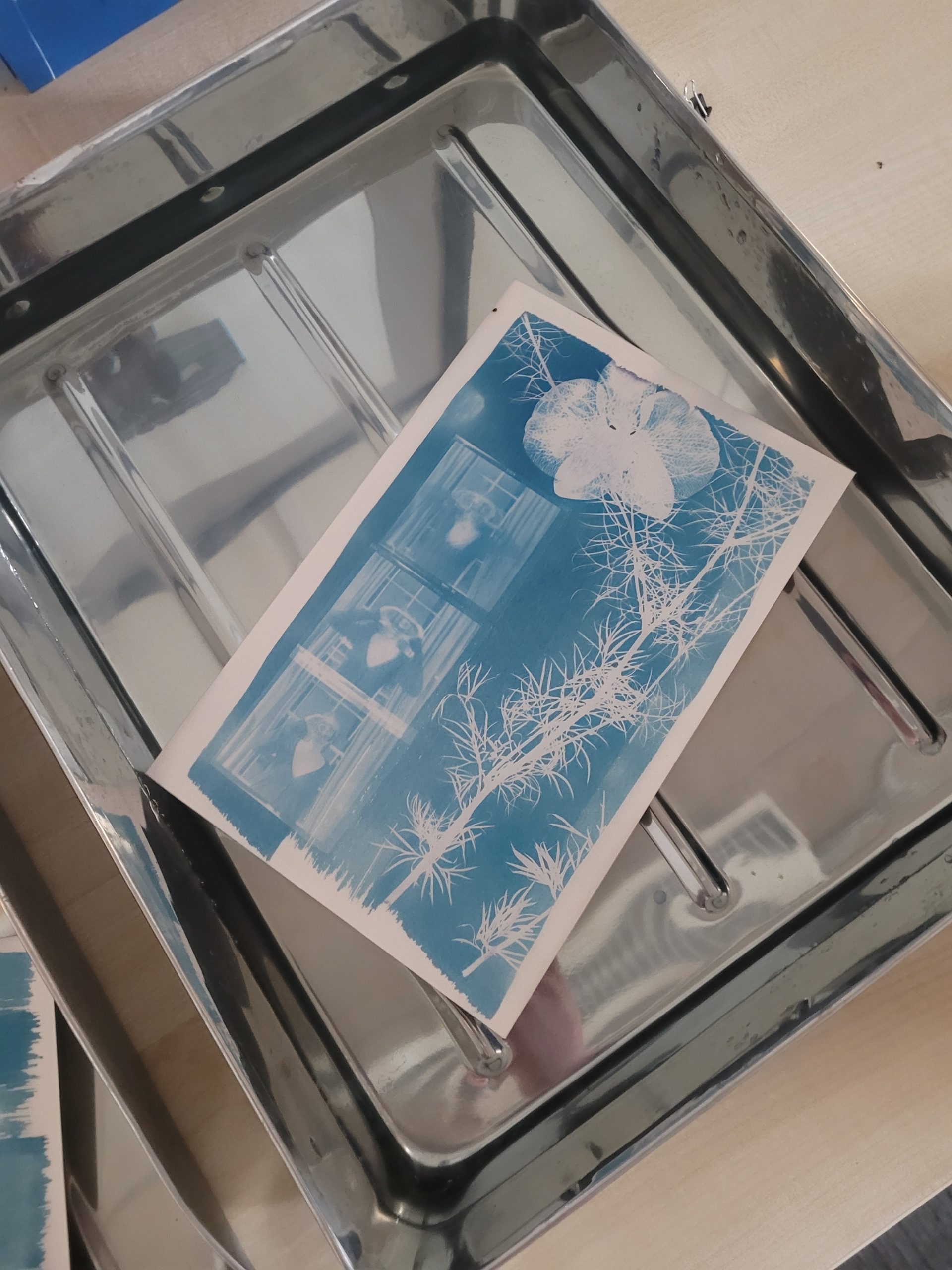 We have collaborated with other facilitators too. Suzie from Filwood Community Centre came to run a session making cyanotypes (blueprints of photo negatives, flowers, or objects). They usually expose in UV light from sunshine but since it was a rainy day, we went for a DIY setup using a UV light bulb to expose our prints inside. It was fun to reminisce over KWMC’s origins as a photography studio!