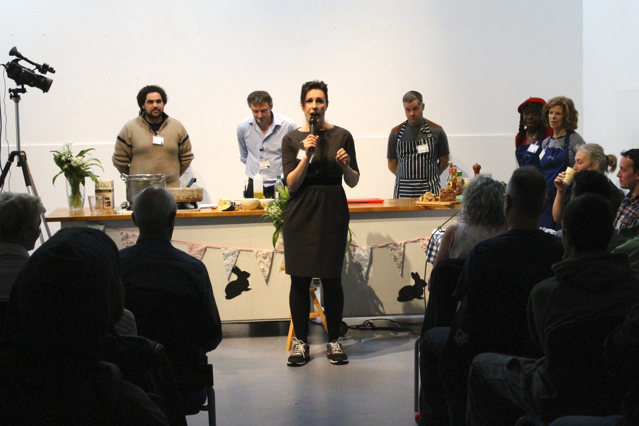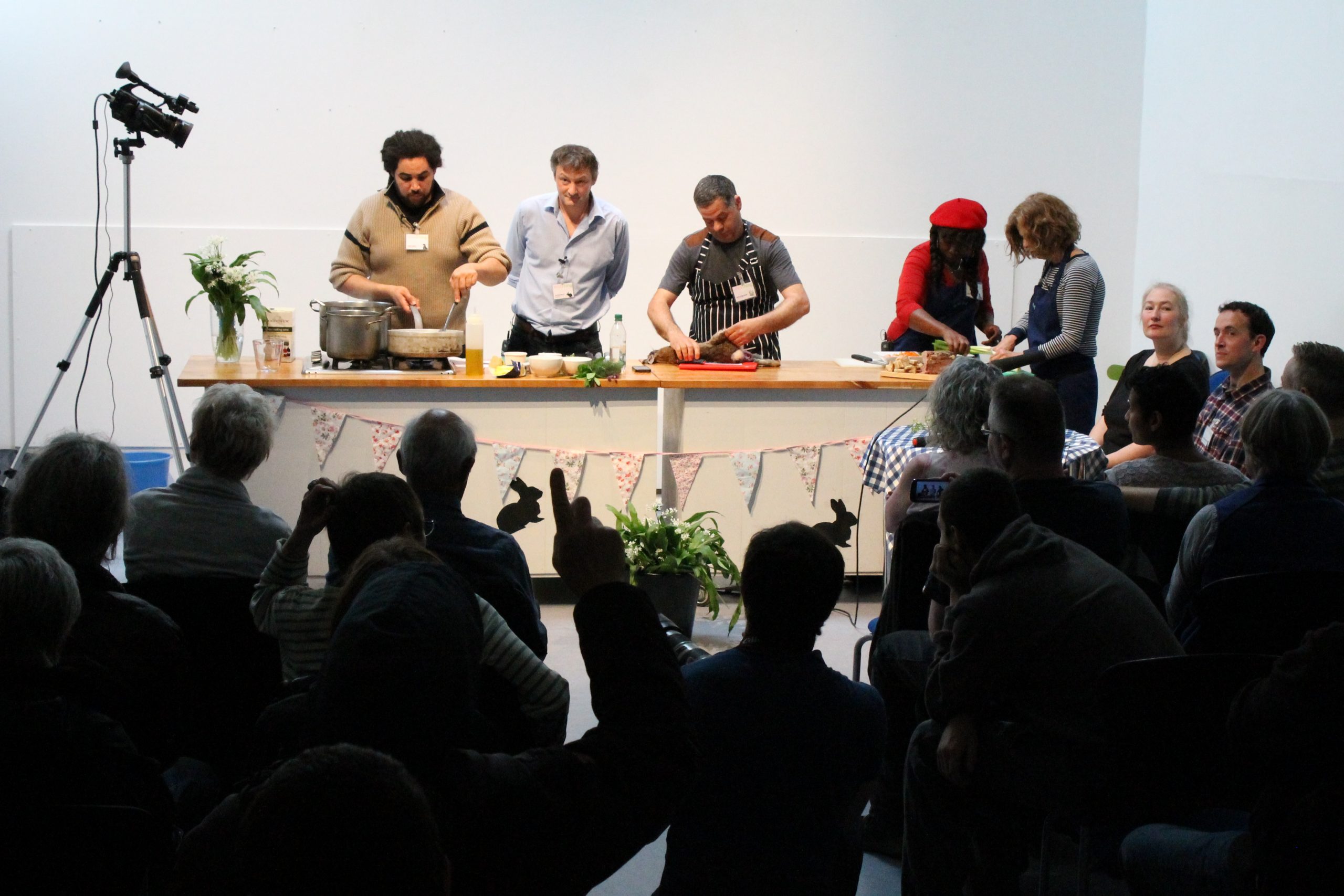 We started proceedings with a Saturday Kitchen-style cooking demonstration, which included the skinning and cooking of a rabbit and the preparation of wild garlic risotto. This was followed by a panel discussion exploring the legality, ethics and health benefits of sourcing wild food, including plants and fungi, rabbits, pigeons and fish. There was also a produce market where visitors could get a taste of locally-sourced food. The event culminated in a foraging walk in the green spaces of Knowle West.