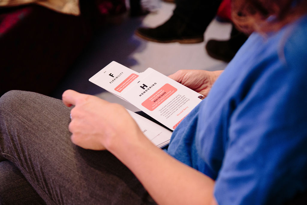 To launch the cards, in November 2022 we hosted a gentle evening of connecting and reflecting using the cards. It was a lovely way to connect with each other and discuss care. When reflecting on the cards, people said things like: